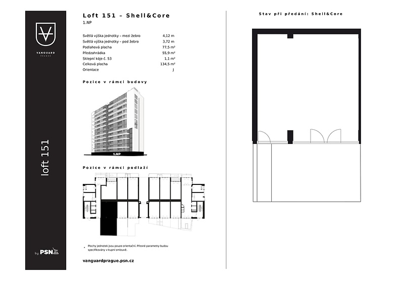 A spacious one-bedroom loft with a floor area of flat{area}living m² in the Vanguard project is a dream come true for those who want more than just a place to live. The open-plan shell & core design gives you complete freedom – create your home your way, whether it’s a generous living room with kitchen or a peaceful bedroom with facilities The apartment on the floorNo. floor also includes a private garden, extending the living space and providing a pleasant spot to relax with views of the surroundings. The unit also includes a cellar space. The building’s high standards include a glass facade, brick and double soundproof partitions between the units, fire-resistant glass partitions, videophones, preparation for exterior blinds, air-conditioning, heat recovery, and more. Residents can enjoy a reception desk with concierge service, a wellness and spa zone, a fitness center, a cinema / party room, a glass 18-meter swimming pool, a meeting room, and a laundry room. Modřany is quickly turning into one of the most sought after districts in Prague. The former industrial zone is becoming a modern residential area with complete civic amenities, landscaped greenery, and excellent access to the center - by car along the embankment, by tram, or by bike along the popular cycling path. Just a few minutes from the house are kindergartens and elementary schools, international educational institutions, shops and sports facilities - including a 9-hole golf course. Within walking distance you will find cafes, a medical center, and other services that make Modřany a place for comfortable everyday life.