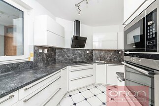 Detached 4 bedroom - 3 bathroom family house in Prague 5 - Jinonice, quiet residential location within a short walk to the German School (DSP), metro and bus stops, Galerie Butovice shopping mall. The very nice family house is renovated including kitchen with a brand new kitchen cabinets and appliances. Total area of the house is 312 sqm. The family house offers on the groundfloor a hall, a living room with a dining area and an access to garden, a fully fitted kitchen, a winter garden, one room/bedroom or study, a bathroom. On the first floor there are 3 bedrooms, a bathroom with toilet, a cloakroom. On the basement there is a guests room and a bathroom. Wooden floors and tile floors with underfloor heating, gas boiler. Well kept large garden 670 sqm with a lake for raining water. Two car garage. The family house is equipped with a high technical standard, particularly in the ecological direction. The house is situated in Jinonice with all civic amenities, easy reach to the center and the Václav Havel airport, the international schools, and with a lot of greenery thanks to neigboring nature park Vidoule.