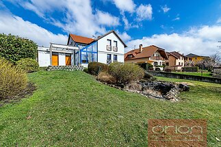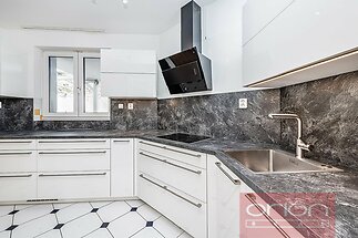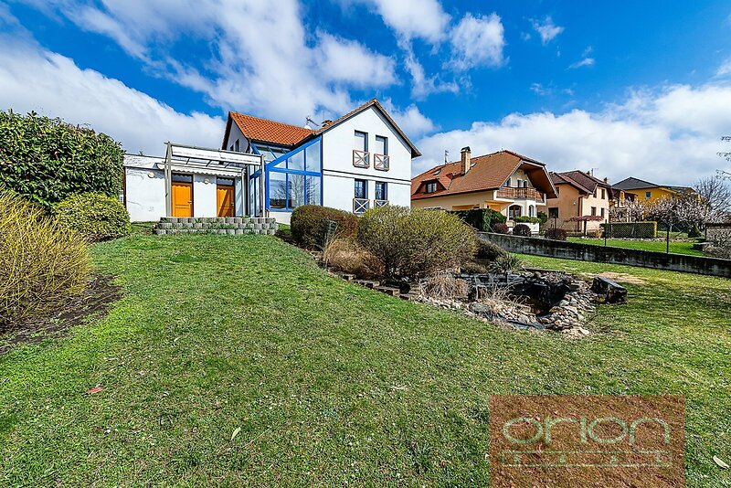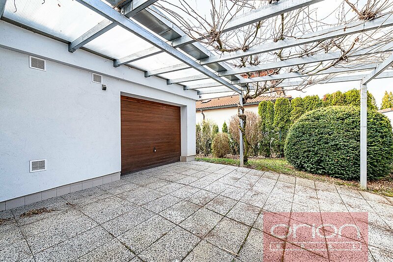 Detached 4 bedroom - 3 bathroom family house in Prague 5 - Jinonice, quiet residential location within a short walk to the German School (DSP), metro and bus stops, Galerie Butovice shopping mall. The very nice family house is renovated including kitchen with a brand new kitchen cabinets and appliances. Total area of the house is 312 sqm. The family house offers on the groundfloor a hall, a living room with a dining area and an access to garden, a fully fitted kitchen, a winter garden, one room/bedroom or study, a bathroom. On the first floor there are 3 bedrooms, a bathroom with toilet, a cloakroom. On the basement there is a guests room and a bathroom. Wooden floors and tile floors with underfloor heating, gas boiler. Well kept large garden 670 sqm with a lake for raining water. Two car garage. The family house is equipped with a high technical standard, particularly in the ecological direction. The house is situated in Jinonice with all civic amenities, easy reach to the center and the Václav Havel airport, the international schools, and with a lot of greenery thanks to neigboring nature park Vidoule.