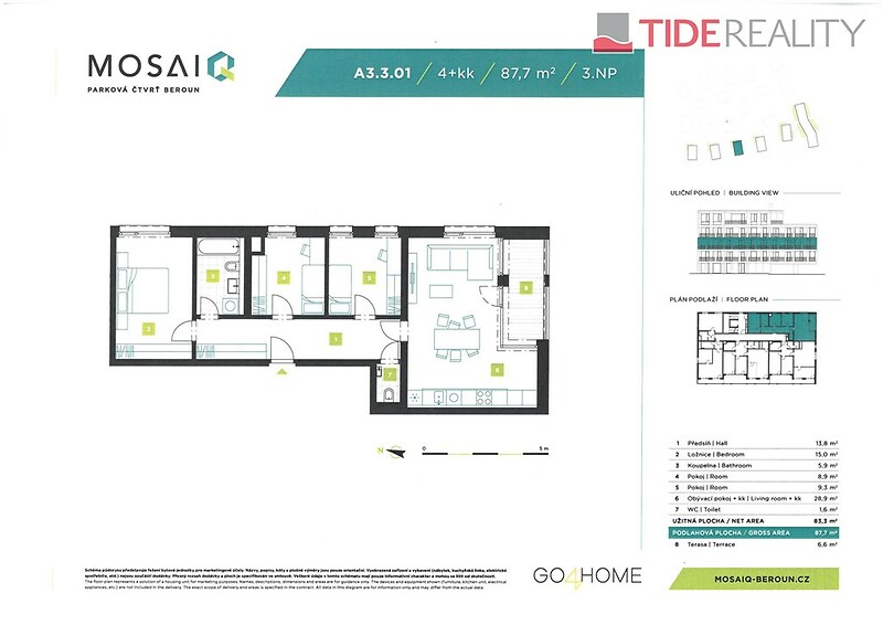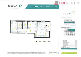 Find a new home in Beroun with us! Enjoy peaceful living amidst picturesque nature yet with everything families need for comfortable living and leisure, plus quick access to the metropolis. The sale of apartments in the park district of MOSAIQ Beroun has started. You can therefore choose from a wide range of properties with different layouts. The generously conceived set of apartment buildings offers a wide range of apartments from 1+kk to 5+kk with terraces, balconies, or front gardens. Completion in 2027. This specific apartment 4+kk with a floor area of 88 m2 and a terrace of 6.6 m2, is located on the 3rd floor of the five-story building A4 and has a very pleasant southeast orientation. Each 3,4,5+kk apartment unit also has a choice of at least 2 outdoor/indoor parking spots, which are not included in the price of the apartment, and it is also possible to purchase a cellar for larger apartments. The entire project offers a large selection of 3,4,5+kk apartments ranging from 88 to 120 m2 even on higher floors and with spacious terraces. At the moment, it is also possible to customize units to some of your specific requirements, so do not hesitate to contact us. Standard apartment features include floating floors, interior doors with a height of 210 cm, modern bathroom fittings, windows with colored frames and triple glazing insulation, and preparation for external blinds. The apartments will have modern data cabling and an STA connection. The project will utilize smart heating technology that works with two heat sources – heat pumps and natural gas. The new residential district is bordered by Na Máchovně street and Na Morákově street, where houses will be built on a gentle slope leading up to the top of Děd hill. The central building of the first phase of this project is house "B" with a tower, followed by a row of pleasant four-story houses surrounded by greenery. The project has valid building permits and already secured supplies of drinking water from the municipal water supply. Quality and affordable housing near the center of Beroun and Prague. The location in the picturesque landscape of Berounsko with good accessibility from Prague (just 30 km), whether by the D5 motorway or numerous train or bus connections. 20 minutes by car to Zličín metro station. Beroun is an ideal place for family living with a high level of safety and a wide range of services and many opportunities for active leisure. Within walking distance or in the immediate vicinity of the project, there is a school, kindergarten, shopping network, public swimming pool, multi-sport complex, football field, network of cycling paths, and more. I am happy to answer your questions and assist with selecting another suitable apartment from this project. Take advantage of all the benefits of acquiring property in advance.