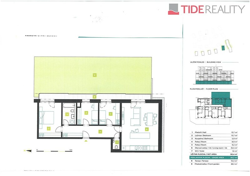 Find a new home with us in Beroun! Peaceful living amidst picturesque nature, yet with everything families need for comfortable living and leisure, plus within quick reach of the capital. The sale of apartments in the MOSAIQ Beroun park district has already begun. You can therefore choose from a wide range of properties with various layouts. The generously designed complex of apartment buildings offers a wide range of apartments from 1+kk to 5+kk with terraces, balconies, or front gardens. This specific apartment 4+kk with a floor area of 94.7m2, a terrace of 14m2, and a garden of 86m2 is located on the 1st underground floor (at ground level) of the four-story building E4. This apartment has a choice of at least 2 parking spots, outdoor/indoor, and a cellar (not included in the price). Throughout the project, there is a large selection of 3,4,5+kk apartments ranging from 88 to 120m2, also on higher floors and with spacious terraces. Currently, it is possible to customize the units to some of your specific requirements, so do not hesitate to contact us. The standard equipment of the apartments includes floating floors with underfloor heating, interior doors with a height of 210 cm, modern bathroom fittings, large format windows with colored frames and insulating triple glazing, preparation for external blinds. The apartments will have modern data wiring through structured cabling and an STA connection. The project will use smart technology for heating, which works with two heat sources - heat pumps and natural gas. The new residential district is bordered by Na Máchovně and Na Morákově streets, where the houses will grow on a gentle slope that rises to the top of Děd. The project has a valid building permit and already secured supplies of drinking water from the municipal water supply. Quality and affordable housing near the center of Beroun and Prague. The location in the picturesque landscape of Beroun region with good accessibility from Prague (just 30 km), whether by the D5 motorway or numerous train or bus connections. 20 minutes by car to Zličín metro station. Beroun is an ideal place for family living with a high level of safety and a wide range of services and many opportunities for active leisure. Within walking distance or in the immediate vicinity of the project is a school, kindergarten, network of shops, public swimming pool, multifunctional sports complex, football field, network of bike paths, and more. Possibility of financing by mortgage loan, with which we are happy to help. 85% of the purchase price will be paid in 2027. I am happy to answer your questions and help with the selection of another suitable apartment from this project. Take advantage of all the benefits of acquiring a property in advance.