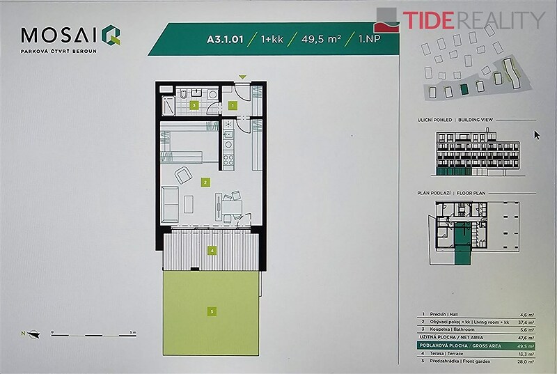 Find with us your new home in Beroun! Enjoy peaceful living amidst picturesque nature, yet with everything you need for a comfortable life and leisure, and all within quick reach of the metropolis. You can choose from a wide range of properties of various layouts. A generously designed complex of residential buildings will offer a wide range of apartments from 1+kk to 5+kk with terraces, balconies, or front gardens. This specific 1+kk apartment with a western orientation, having a floor area of 49.5 m2 with a 12.3 m2 terrace leading to a fenced front garden of 27.4 m2, is located on the ground floor of the four-story building A3 and features an option for 1 parking spot, which is not included in the price. You can also choose from larger apartments, 2+kk, 3+kk, 4+kk with balconies, loggias, and terraces. At this moment, it is possible to customize the units to meet some of your specific requirements, so do not hesitate to contact me. The standard equipment of the apartments includes floating floors with underfloor heating, interior doors with a height of 210 cm, modern bathroom fittings, large-format windows with colored frames and triple-glazed insulation, and preparations for external blinds or air conditioning. The apartments will have modern data networks via structured cabling and an STA connection. The project will utilize smart technology for heating, which works with two heat sources – heat pumps and natural gas. The new residential district is bordered by Na Máchovně and Na Morákově streets, where the houses will be constructed on a gentle slope rising towards the peak of Děd. The project has official building permits, construction has begun, and final approval is expected in 2027. The location in the scenic landscape of Beroun, with good access from Prague (just 30 km), whether by the D5 motorway or numerous train or bus services. A 20-minute drive to Zličín metro station. Beroun is an ideal place for living with a high level of safety and a wide range of services, along with many options for active leisure. Within walking distance or in the immediate vicinity of the project, there are schools, kindergartens, a network of shops, a public swimming pool, a multi-purpose sports complex, a soccer field, a network of cycling trails, and more. The possibility of financing with a mortgage loan, which we are happy to assist with. 85% of the purchase price will be paid only in 2027 after final approval. I am happy to answer your inquiries or help with selecting another suitable apartment from this project. Take advantage of all the benefits of purchasing a property in advance.