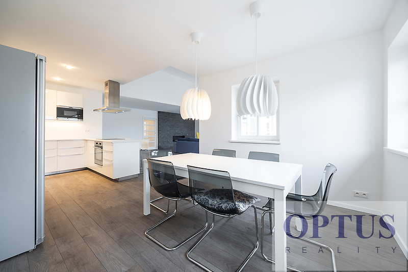 Prague 1 - Old Town, Dušní street – located in a quiet street, in the most prestigious location in Prague close to the Old Town Square and the Vltava riverbank, just a few steps from Pařížská Street. Unique brand new duplex apartment 6 + kitchen corner (in total of approx. 218 m2) + a terrace of 8 m2 facing a quiet courtyard, after high-quality renovation; situated on the 5th floor with elevator in an Art Nouveau house 100% free of short-term accommodation. In the basement of the house is a luxury private wellness center including an indoor pool (10 x 3.8 m) a sauna and a large yoga/fitness room. The wellness is available exclusively to residents of the house. The tenant can every day reserve a time slot for private use of the entire area. The usage of the wellness is free of charge subject to a separate user agreement with the owner. The apartment consists of an open space living room of 67 m2 connected with a kitchen and dining area, with an ethanol fireplace and access to the terrace overlooking a spacious courtyard, four bedrooms (2x 24 m2, 20 m2 and 15 m2) – the master bedroom has en suite bathroom), work room of 11 m2, two bathrooms, a separate guest toilet, a laundry room, a storage room, and an entrance hall with a wardrobe. Additional equipment of the apartment: a fully fitted modern kitchen unit, washer, dryer, wardrobes, cabling for high-speed Internet (an optical cable) - the apartment has Ethernet, air-conditioning, laminated floors and pavement; floor heating - apartment is heated by a heat pump. Also included is an extra storage space in the basement of the house. A parking for bikes is available in the courtyard of the house. The apartment is offered as partially furnished, but it is also possible to leave it unfurnished or can be equipped with furniture of choice under increase of rent. The minimum rental period is two years. Price 125,000 CZK/month + a fix payment of 10,000 CZK/month for utilities incl. energies and high speed internet access + agency fee of 1 months’ rent. Requested security deposit of 2 months´ rent. The Real Estate agency has not the energy label of the property at disposal, therefore we classify the energy performance level “G”.
