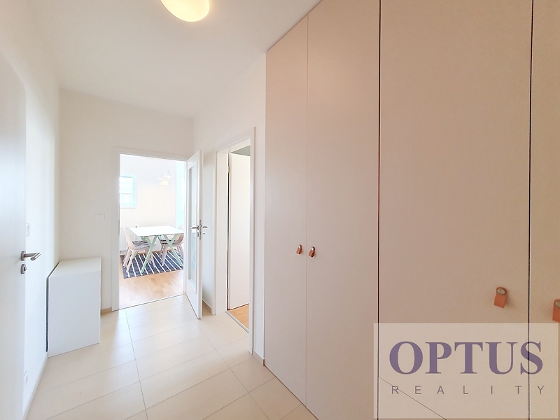 Prague 5 – Jinonice, Pod stolovou horou street - popular residential area next to the German School and Vidoule Nature Park, in a walking distance to subway station Nove Butovice, nearby shopping mall Galerie Nove Butovice, area with perfect public transport to the city centre and perfect access to the highways D5, D1 and to the airport. Modern designer furnished apartment size 2 + kitchen corner (in area of 56.4 m2) + balcony of 4.75 m2 - west orientation; situated on the 4th floor with lift in a new residential building – part of residential complex Botanica. Consisting of a spacious living room of approx. 28 m2 with a fully fitted kitchen and access to the balcony, one bedroom of approx. 13 m2, one full bathroom (with a shower and toilet), and an entrance hall with a big built-in wardrobe. Other equipment of the apartment: modern furniture according to the photos, a fully equipped design kitchen unit including built-in appliances (electric cooking hob, electric oven, dishwasher, microwave, and refrigerator with freezer), LCD Tv set, washing machine combined with dryer, the apartment also has cabling for high-speed internet connection (up to 1 Gb/s), wooden floors, outside safety sun blinds, and central heating. The rent includes 1 basement storage unit of 4.5 m2. It´s possible to rent a garage parking place in the building for extra charge – to be verified in advance. Preferred a tenant without pets. Price 25,000 CZK/month + utilities (services charge of 4,000 CZK/month + electricity in the apartment) + internet cost + agency fee of 1 month´s rent. Requested security deposit of 2 months´ rent. The energy performance level of the building was classified according to Order 78/2013 Coll. as “B”.