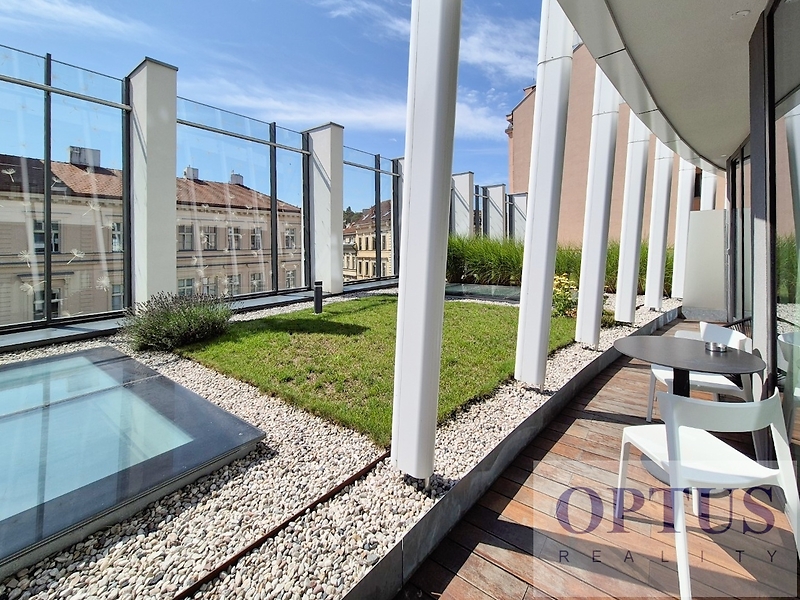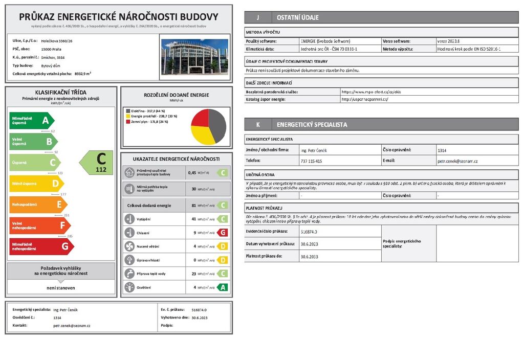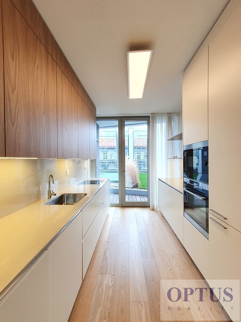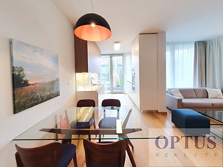 Prague 5 – Smíchov, Holečkova street – located in a residential area in the neighbourhood of Kinský Garden and Petřín Hill; within easy reach of the French School and subway station Anděl and the shopping mall Nový Smíchov; area with regular bus connections and quick access to the city center and the airport. Furnished premium apartment 2 + kitchenette (in area of 70.93 m2) + terrace with a garden of 109.15 m2, situated on the on the 2nd floor of a new building with a private wellness & spa with an indoor pool, a reception, a security service, a large common terraced garden, and garage parking. The apartment consists of a living room with a fully fitted open plan kitchen and dining area (35.05 m2), a bedroom with a clothes closet (18.15 m2), a full bathroom (with a bath tube, bidet and toilet), a separate guest toilet, and an entrance hall; the terrace is accessible from both main rooms. Additional equipment: quality Italian furniture according to the photos including a sofa bed in the living room and a high-quality bed with a medical mattress in the bedroom, a fully equipped kitchen (with appliances and kitchenware), a washer combined with dryer, bed linen, towels, TV set, security alarm system, Wi-Fi internet connection included, heat recovery ventilation, hardwood floors and tiles, underfloor heating. The tenant has the opportunity to use the private wellness & spa with an indoor pool, hot tub and sauna in the building - for an extra fee of 2,500 CZK/month/person; there is also a fitness center (Prisma Institute) in the building for an additional fee according to the price list. Parking possible in the underground garage in the building for 230 EUR/month (+ VAT 21%). Price 2,200 EUR/month (+ VAT 12%) including all utilities and internet connection + agency fee of 1 month´s rent. The rent includes also cleaning of the apartment twice a month, including changing bed linen and towels. The security deposit makes 1 months’ rent. The energy performance level of the building was classified according to Order 264/2020 Coll. as “C”.