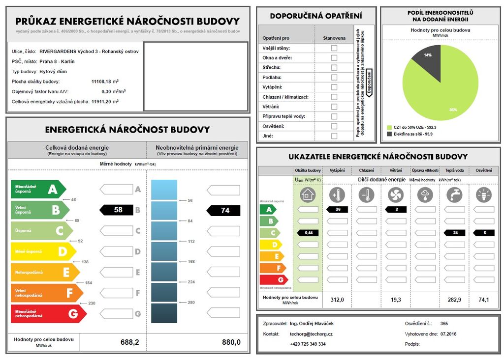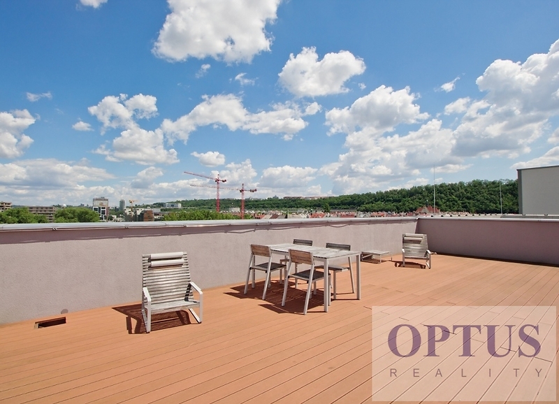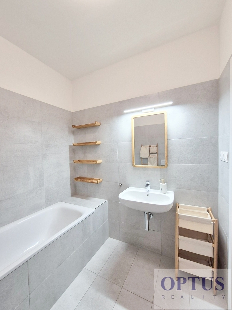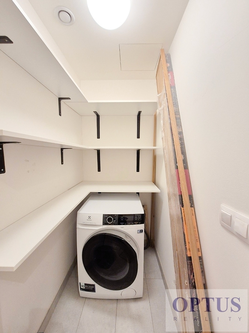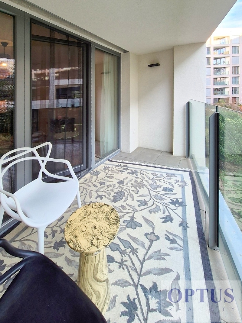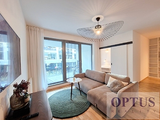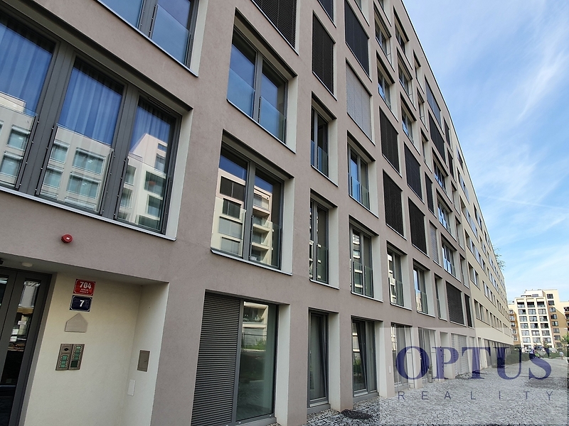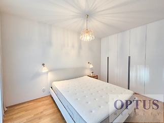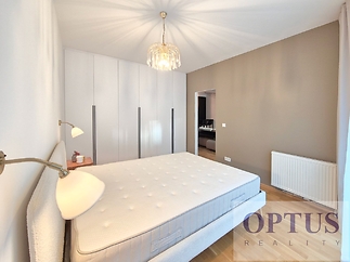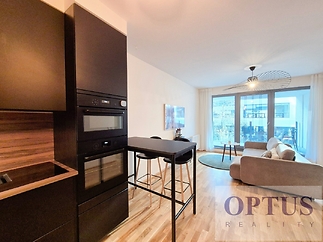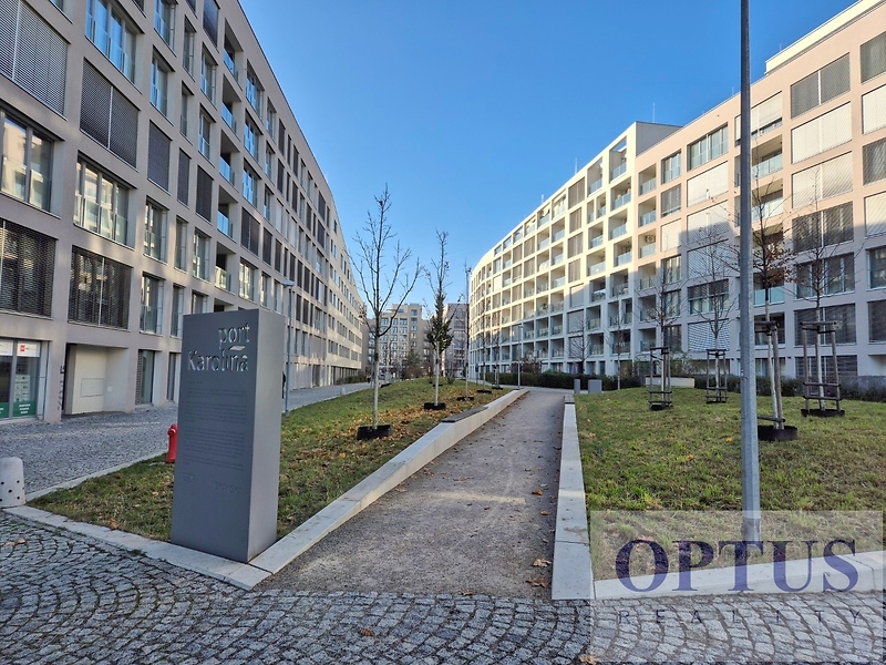 Prague 8 - Karlín, Breitfeldova street - located in attractive location on the border of Prague 1 and 8 in a sought-after part of the city, 2 minutes walk from the Křižíkova metro station; popular neighbourhood with many cafes, stylish restaurants, within easy reach of the center, a cycling and running trail runs around the house, a fitness / relaxation center and a golf course are nearby. Let us offer you for rent a brand new luxury furnished apartment size of 2 + kitchenette (in area of 56.9 m2) + balcony of 5.7 m2 with a south orientation; situated on the 2nd above floor of low-energy building with an elevator in the recently built Port Karolina residential complex with a reception desk, security service using a camera system and a shared terrace on the 7th floor. The apartment consists of an open space living room with a fully integrated open-plan kitchen and with an access to the loggia facing a quiet courtyard, one bedroom, one bathroom with a bathtub + toilet, a storage room, and an entry hallway. Apartment equipment: The apartment is equipped with luxurious designer furniture and lighting according to the photos, including a Samsung The Frame TV, with built-in wardrobes and a high-quality kitchen with built-in appliances (fridge with freezer, hob with built-in extractor hood, electric oven, microwave with baking function and dishwasher). The apartment also has a washing machine with dryer, high-speed internet (optical cable 500 Mb/s) is included in the rent, wooden floors and central heating. Possible to rent a garage parking space for an extra charge - according to the current situation. The apartment is suitable for maximum 2 persons, minimum lease period is 1 year. Price 34,000 CZK/month + utilities 4,500 CZK/month (for one person or 5,500 CZK/month for two persons) + electricity cost + agency fee of 1 month´s rent. Requested security deposit of 2 months´ rent. The energy performance level of the building was classified according to Order 78/2013 Coll. as “B”.