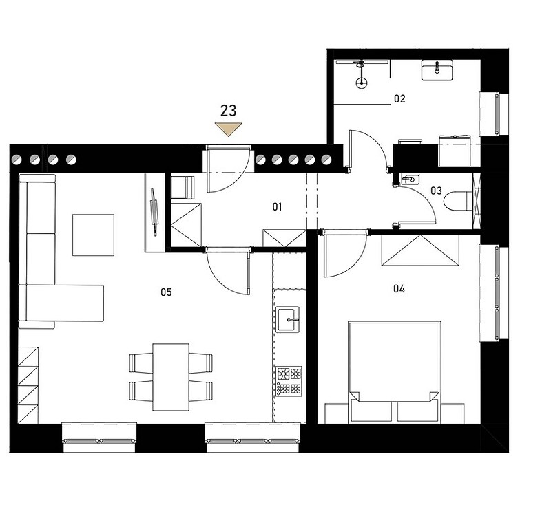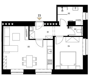 Residential unit No. 23 with one bedroom and total area of 58 m² is located in a carefully renovated apartment building, on the 2nd floor. The unit is finished to "fit out" standard, i.e. ready to move in - including final finishes, sanitary fittings and preparation for kitchen installation. There are wooden floors, new windows and a modern bathroom. The apartment has a cellar of 2.8 m². The whole house has been sensitively renovated and residents can now enjoy practical common areas such as a fitness room, sauna, bike room, buggy room or a quiet courtyard for relaxing. The location offers a pleasant residential environment with all amenities nearby. Within walking distance are cafes, restaurants, shops, schools, medical facilities and public transport stops. Within easy reach is also the city green and parks, which encourage relaxation or sports.