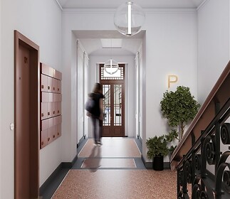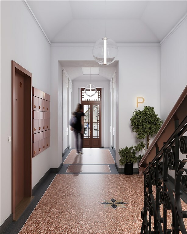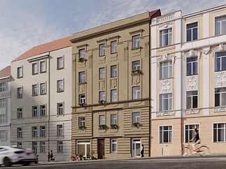 The offered apartment unit No. 52 with two bedroom and total area of 66.6 m² is located in a carefully renovated apartment building, on the 5th floor. The unit includes a cellar of 2.8 m². The unit is finished to "shell & core" standard, i.e. to be finished according to your own needs. The whole house is undergoing a sensitive renovation and residents will be able to enjoy new common areas such as a bike room, a carriage room or a quiet courtyard for relaxation. The location offers a pleasant residential environment with full amenities nearby. Cafés, restaurants, shops, schools, medical services, and public transport stops are all within walking distance. The city’s green spaces and parks are also close by, offering ideal spots for relaxation or outdoor activities.