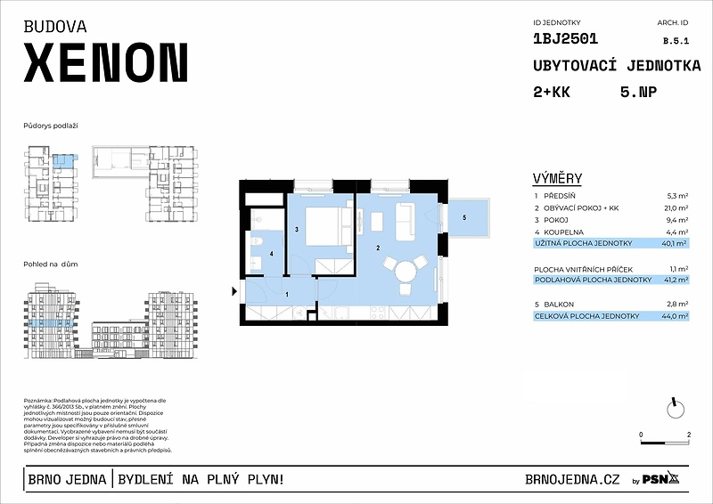 This bright apartment with a balcony is situated in the new Brno Jedna project, which offers modern urban housing with complete facilities and excellent access to the city center. Unit no. 2501 with a one-bedroom layout and a total area of 44 m² on the 5 floor will offer you a harmonious space for living, whether you are looking for your own apartment or are a couple starting a joint chapter. The airy living room with a kitchenette freely flows into the bedroom, which is complemented by an elegant bathroom with a shower and toilet. Thanks to its orientation to the S, V, the apartment enjoys an ample amount of natural light. The unit includes a balcony, perfect for enjoying your morning cup of coffee in the fresh air. A cellar and a parking space must be purchased for each unit. The apartment will be ready to move into immediately with finished floors, a fitted bathroom, and a space for a kitchen unit. Standards include high quality materials, triple-glazed windows, and in selected units, preparation for outdoor shading. Brno Jedna, or Brno One, is more than just a residential building, it is a place where you will live well. The building boasts a roof terrace with a grill, a workout zone, a bike room, a laundry room, and a stroller room - all of which will offer you the comfort of urban life. A new district with a park, bike paths, and services is developing nearby. The city center is within reach in just 5 minutes by public transport or by car.