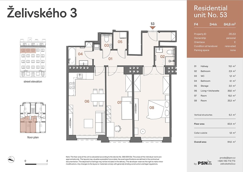 This bright two bedroom apartment with a floor area of 82.80 m² is part of the Želivského 3 project, which brings contemporary living to the historic Žižkov district. Following a complete renovation, the building now offers comfortable and functional homes designed for everyday urban life. The apartment, located on the 5th floor, features a well-designed layout that includes a living area with kitchen preparation, an entrance hall, two separate bedrooms, a storage closet, two bathrooms, and a toilet. A private basement cubicle offers additional practical storage space. The unit is finished in a stylish fit-out, complete with new wooden flooring and a timeless bathroom fitted with premium Laufen and Grohe sanitaryware. The fully renovated building features a peaceful inner courtyard with greenery and comfortable seating, a laundry room, and a small fitness area. The modernized common areas offer a contemporary living environment that meets today’s housing standards. Situated in a well-established part of Žižkov, the Želivského 3 project is just steps from the Nákladové nádraží Žižkov tram stop. Residents enjoy easy access to city life, including popular cafés, restaurants, shops, services, and the nearby Parukářka and Vítkov parks. The Želivského metro station is only minutes away, with the city center reachable in approximately ten minutes.