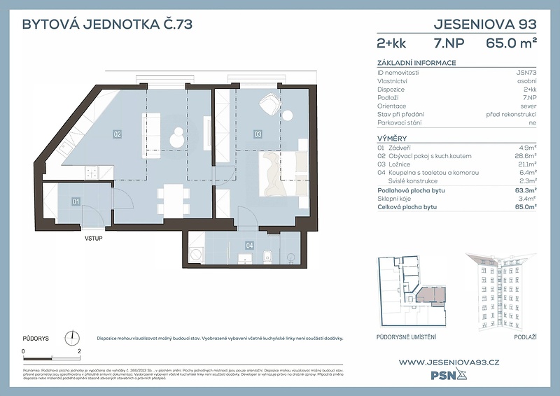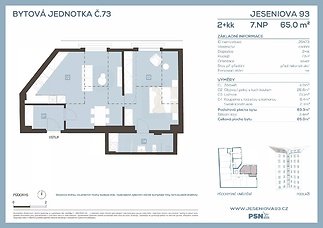 This one-bedroom apartment with a floor area of 63.3 m² is part of the Jeseniova 93 project, which sensitively combines the elegance of a historical building with modern comfort. The house is in Žižkov - a lively district full of cafes, restaurants, and cultural venues, just a few steps from Vítkov Park and a minute's walk from the Biskupcova tram stop. The floor plan of the unit on the 7th floor includes a spacious living room with preparation for a kitchenette, a bedroom, a bathroom with a shower and a toilet, and a hallway with plenty of space for built-in wardrobes. The unit also includes two cellars with a total area of 3.4 m². The unit is in a state of renovation, which gives the future owner the opportunity to create an interior exactly according to their own design ideas. The building boasts luxuriously renovated common areas with marble tiles, designer lighting made of cut glass, and a new glass elevator. The building also includes a landscaped courtyard with benches and raised flower beds - an ideal place to relax or have a barbecue with friends. Žižkov is one of the liveliest districts in Prague - with a wealth of bars, cafes, and restaurants, and something new to discover every day. For moments of peace and active relaxation, there is Vítkov Park - the green heart of Žižkov with amazing views of the city, cycle paths, and picnic areas. Nearby are also the Židovské pece Park, Parukářka, and the Pražačka sports complex. The area has perfect transport connections with nearby Jeseniova Street, the Biskupcova tram stop - which is right in front of the building - and the Ohrada tram stop. The center is easily reachable by public transport and by car.