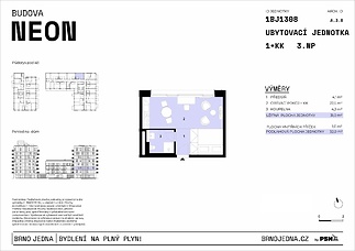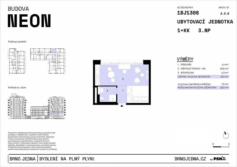 This practical studio apartment is situated in the new Brno Jedna project, which offers modern urban housing with complete facilities and excellent access to the city center. Unit No. 1308 with a studio layout and a total area of 32 m² will offer you a harmonious space for living, whether you are looking for your own apartment or an investment opportunity. The unit on the 3 floor includes a living area with preparation for a kitchenette, an elegant bathroom with a shower and toilet, and an entrance area with space for storage. A cellar and a parking space must be purchased for each unit. The apartment will be ready to move into immediately with finished floors, a fitted bathroom, and a space for a kitchen unit. Standards include high quality materials, triple-glazed windows, and in selected units, preparation for outdoor shading. Brno Jedna, or Brno One, is more than just a residential building, it is a place where you will live well. The building boasts a roof terrace with a grill, a workout zone, a bike room, a laundry room, and a stroller room - all of which will offer you the comfort of urban life. A new district with a park, bike paths, and services is developing nearby. The city center is within reach in just 5 minutes by public transport or by car.