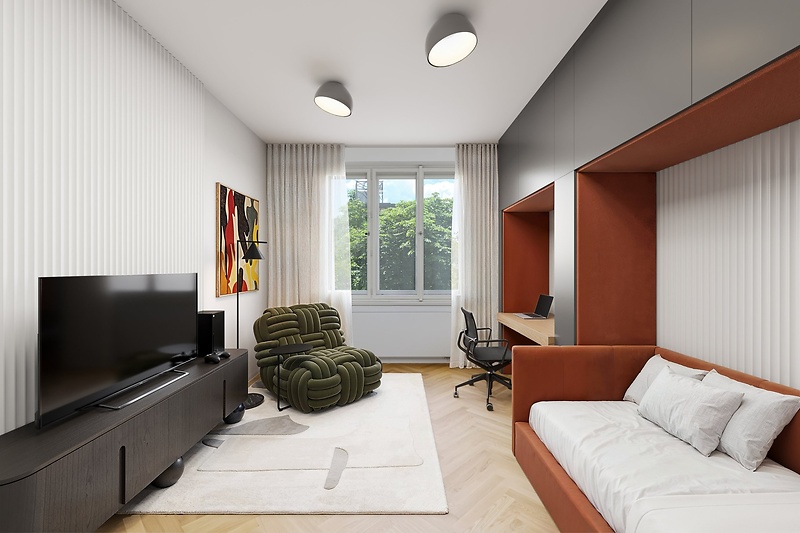 This two-bedroom apartment with a floor area of 115.1 m² offers generous space that will win you over from the first step. It is located on the 4th floor of a classic building that has been luxuriously reconstructed and is ready to be finished in a fit-out standard - new parquet flooring, plaster, interior and entrance doors, and completely new wiring give you the ideal basis for creating a home exactly according to your design ideas. The large living area with preparation for a kitchen is the heart of the apartment – bright, airy and perfect for social gatherings. The apartment has two bedrooms offering privacy and peace, a bathroom, a separate WC, and plenty of storage space. Furthermore, there is a practical cellar space. The entire building combines the nobility of historical architecture with modern comfort. The timeless entrance area boasts wood, marble, brushed bronze, and glass design details. Furthermore, there is a reception desk, a sauna, and a courtyard with a garden - the perfect place for peaceful moments in the middle of the city. Vinohrady is synonymous with a lifestyle that combines elegance and energy of the city. Here you will find cafes with fine coffee, bistros serving delicious bites, and wine bars where you know not only the sommelier but also your neighbors by name. Adjacent parks with breathtaking views invite you to relax and be sporty, the farmers' markets are perfect meeting spots, and the local theaters and galleries simply inspire. According to Time Out magazine, Vinohrady is one of the "coolest" neighborhoods in the world. It’s a place where you want to live.