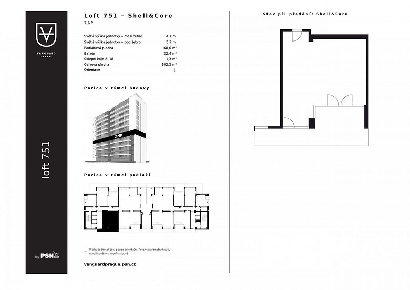 Unique Loft in Vanguard Prague - A Space Where Dreams Come True We present to you a unique opportunity to become the owner of a loft in the iconic Vanguard Prague residence, where industrial design meets modern lifestyle. This loft offers a total living area of 68.6 m² and a generous balcony of 32.4 m². The space is offered as shell/core, allowing your creativity to shine and define your vision of home. Vanguard Prague – Living Like in a 5 Hotel* The Vanguard Prague residence represents the standard of modern living. As a resident, you can enjoy top-notch services and amenities that are part of this prestigious project. The 24/7 reception and concierge ensure your comfort and safety. For moments of relaxation and rejuvenation, there is a private spa with an 18 m pool, jacuzzi, sauna, and steam room, as well as a fully equipped fitness center. A Location That Has Much to Offer The residence is located in the attractive part of Modřany, which combines the tranquility of a residential area with quick access to the center of Prague. There is a tram and bus stop next to the house. The surroundings offer plenty of opportunities for active and relaxing activities – from bike paths along the Vltava River, the Hodkovičky golf course, to modern restaurants and cultural spots. Living in Vanguard is the perfect choice for those looking for a space that combines creativity, design, functionality, uniqueness, and living comfort. This offer represents more than just living – it is a new definition of lifestyle. Property Description • Industrial building • Renovation in 2023 • Wellness • Pool • Private cinema • Reception • 24/7 security • Concierge • Restaurant in the building • Rooftop panoramic terrace • BBQ terrace • Parking spaces • Storage spaces Location • Easily accessible by car, 20 minutes to the city center • Close to public transport stops (tram, bus) • Within reach of a network of shops • In close proximity to the Vanguard project, a nine-hole Golf Country Hodkovičky course awaits you • The Prague A2 trail runs along the right bank of the Vltava River from Mánes past the Podolská waterworks, Prague-Modřany station, to the Zbraslav bridge