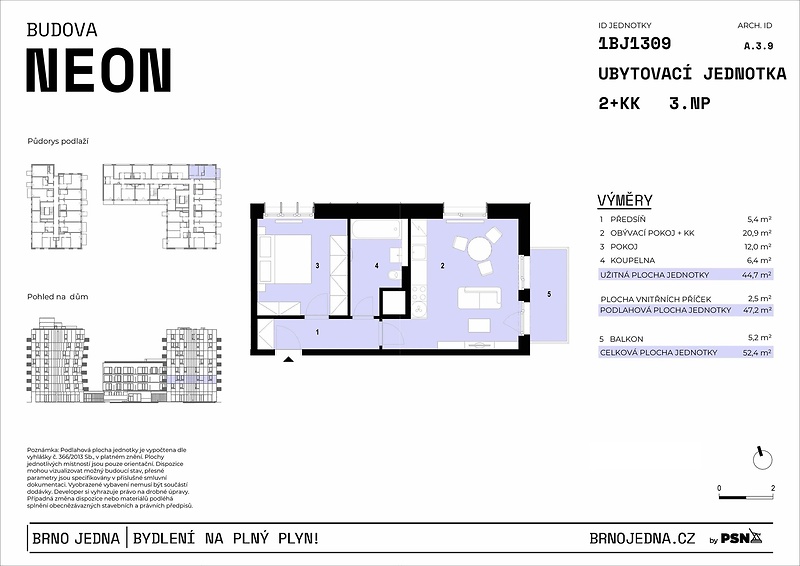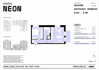 Unit No. 1309 within walking distance of the center of Brno, where there is strong long-term demand for rental housing. Thanks to its location, practical layout, and modern standard, the unit is suitable both as an investment for rental and for future personal use. The layout 2+1 and total area 52.40m² of the unit on the 3 floor provide a well-designed space that is ideal for both investment purposes and future personal living. The unit offers two separate rooms, a kitchen, an elegant bathroom with a shower and toilet, and a balcony that fills the apartment with light throughout the day. The space will be ready to move into with high standards – triple-glazed windows, finished floors, equipped bathroom, and space prepared for the installation of a kitchen unit. Preparation for outdoor shading is available. A basement storage unit and parking space must be purchased with the unit. The Neon&Xenon building represents modern living with complete facilities and excellent accessibility, offering a wide range of residential services: a roof terrace with a barbecue, a workout zone, laundry rooms, a common room, a café, a bicycle storage room, and a stroller storage room. The building will be part of the newly emerging Brno Jedna district with a square and adjacent park, bike paths, sports facilities, and other services. You can reach the city center in 5 minutes by public transport or car. The completion date for construction and handover of the units is the end of 2027