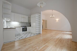 We are offering for rent a spacious one bedroom apartment with a size of 87 sqm and a balcony, located on the 1st floor of a residential building with an elevator in the prestigious area of Prague 2 - Vinohrady, just a few steps from Náměstí Míru. The apartment features an entrance hall, a bright living room with a dining area connected to a fully equipped kitchenette, a bedroom with access to a balcony facing a quiet courtyard, a walk-in wardrobe, a bathroom with a bathtub, and a separate toilet. The apartment is equipped with a washing machine, a gas boiler, and a built-in wardrobe. The kitchen is fully fitted with appliances, including a hob, oven, dishwasher, and fridge-freezer. The floors feature high-quality wooden parquet and tiles. The Prague 2 – Vinohrady area is one of the most sought-after districts in the city, offering full civic amenities, including cafés, restaurants, bistros, shops, and excellent transport connections. Within walking distance are the metro and tram stations Náměstí Míru and I. P. Pavlova (approximately a 5-minute walk). Fast access is also provided to the Prague city ring road and the highway network. For relaxation, nearby parks such as the popular Riegrovy Sady or Havlíčkovy Sady (Grébovka) are just a few minutes’ walk away. A parking space is available for rent at an additional cost.
