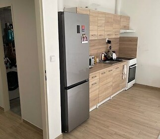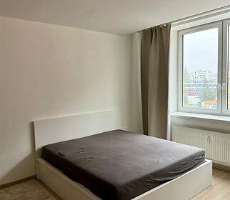 We offer a nice renovated furnished studio apartment (1+kk) with an elevator on the 3rd floor on Na Harfe Street in Prague 9. Available from December 1, 2025. The apartment contains this furniture, which must be purchased from the previous tenant for 35,000 CZK: double bed with mattress, curtains, table, TV and dining set, washing machine, freezer, and fridge, wardrobe.