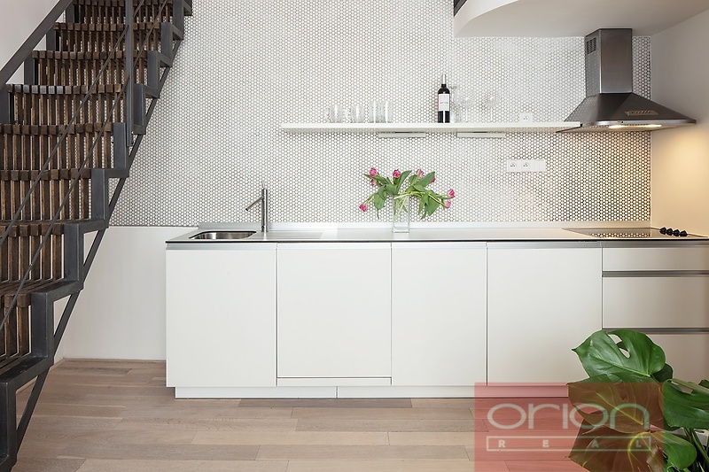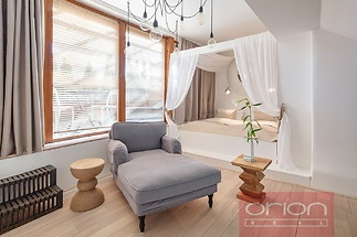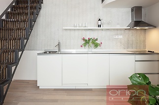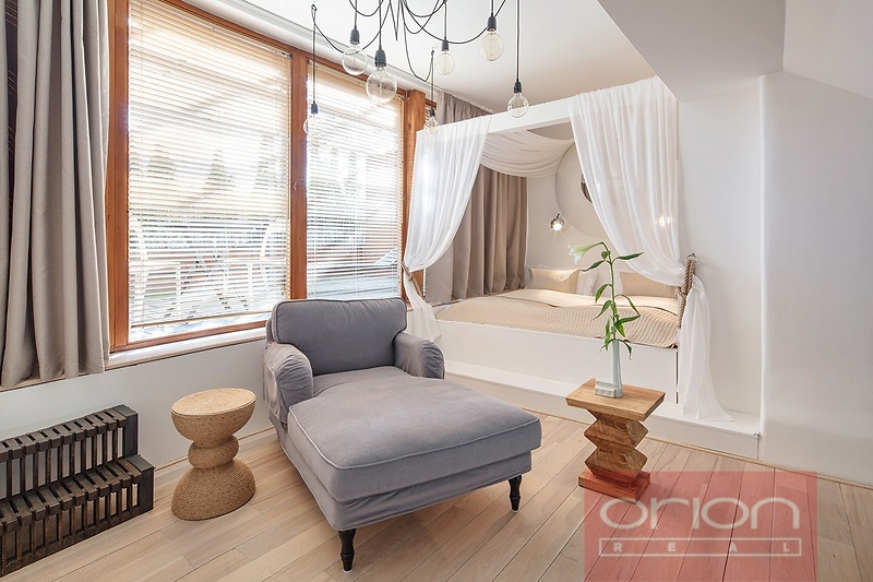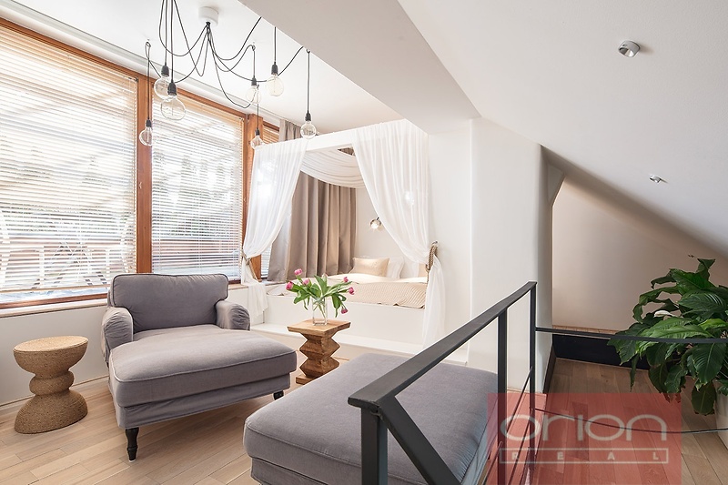 We offer for rent a duplex one bedroom partment with a terrace on the 5th floor of a renovated Art Nouveau house from the 19th century in Prague 5. The house has an elevator. The furnished apartment with an area of ​​38 sqm offers a bedroom with a king size bed with a canopy on the upper floor and a living area with a sofa and access to the terrace. On the lower floor there is a kitchen and dining area with an equipped kitchen, table and chairs, bathroom and toilet, in the hallway there is a wardrobe. The apartment is equipped with TV, SAT, WIFI and air conditioning. Location with excellent transport accessibility by car and public transport, Anděl metro station is 5 minutes by tram, U Zvonu tram stop is a few meters from the house. Nearby there are restaurants, shops and the popular Petřínské sady park. The rent includes wifi + cleaning once a week with change of bed linen and towels.