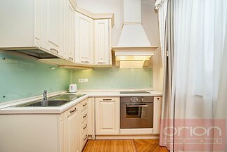 We offer for rent a luxurious furnished studio apartment with a balcony on the 4th floor of a Neo-Renaissance house Rezidence Italská from the end of the 19th century with a well-maintained private garden with a heated pool in the sought-after location of Prague 2 - Vinohrady. The residential house has been completely renovated with preservation of all architectural elements and is equipped with premium and luxurious materials. The luxuriously furnished apartment of 38 sqm with original elementsoffers a living room facing the courtyard with a view of the garden and pool, a fully equipped kitchenette including dishes, a bathroom with a bathtub and a toilet, and a 11 sqm balcony. The apartment is equipped with Italian furniture, hand-woven carpets, luxury appliances, wooden parquet floors and tiles, a washing machine and dryer, air conditioning, videophone, satellite TV. Possibility to arrange regular cleaning service of the apartment. The residence also has a sauna, garages, an elevator, a camera system and a security guard. Part of the house is a famous Italian pastry shop with products imported directly from Italy. Possibility of parking in the underground garage for a price from 200 Euros + VAT. The house is located just a few steps from the Náměstí Míru metro station, a few minutes' walk from Wenceslas Square. There are many cafes, famous restaurants, bistros, local shops, the popular park Riegrovy sady in the vicinity.