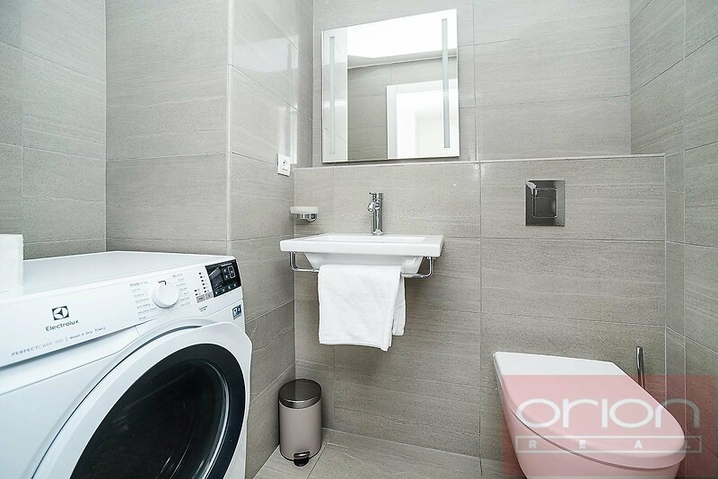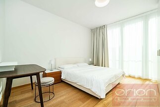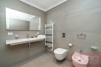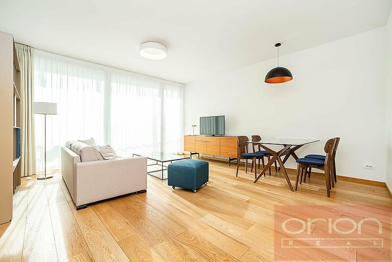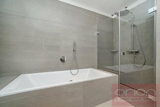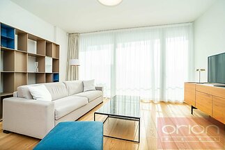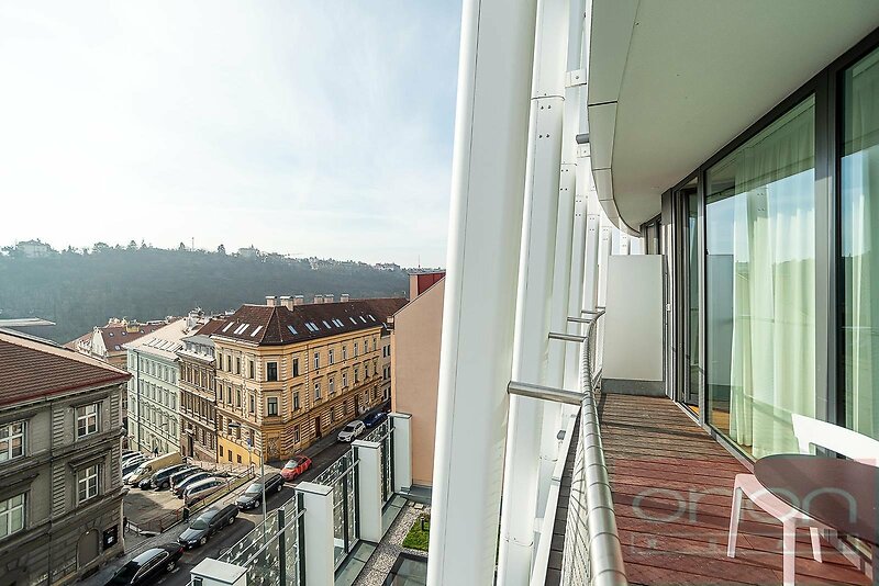 We offer for rent a luxury one bedroom apartment with a terrace on the 2nd floor of the new Ellipsis Residence building with reception, elevator, underground garage, wellness - swimming pool, sauna, and a large garden with a park in the Prague 5 - Smíchov location. The furnished apartment of 59.38 sqm offers an entrance hall, a spacious living room open with a dining room and a fully equipped kitchen with access to a terrace (19 sqm), a bedroom, a bathroom with a bath, shower, bidet and toilet. The equipment includes wooden floors, large-format tiles, French windows, security doors, A/C, internet, storage room. Possibility to rent a garage space for a extra fee of EUR 200 + 21% VAT/month. Popular location Prague 5 - Smíchov with excellent transport accessibility by public transport and by car to the city center as well as to the airport. Walking distance to the metro and tram station Anděl, to the shopping center Nový Smíchov, to international schools. There is a lot of greenery in the immediate vicinity, Kinské sady, Petřínské sady parks. Rent 2,200 EUR + 12% VAT payable in EUR + membership fee for the use of wellness 100 EUR/month. The rent includes energy, services, internet and 2x monthly cleaning of the apartment. The Prisma Institut fitness center is also located on the ground floor of the building. Minimum rental period 1 month, maximum 6 months.