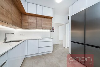 We offer for sale an exceptionally spacious four bedroom apartment with a balcony on the 1st floor of a smaller apartment building with an elevator located in a quiet residential area of Prague 5 - Hřebenka, in close proximity to the Klamovka park. The apartment has a total area of 125.88 sqm and also includes a parking space in the underground garage. The apartment underwent a high-quality renovation in 2022. The layout of the apartment offers an entrance hall, a spacious hallway with built-in wardrobes, a separate kitchen with a modern kitchen unit with a Dekton worktop and all kitchen appliances, 5 rooms, 1 bathroom with a shower and toilet, 1 bathroom with a bathtub, 2 separate toilets and a utility room with a washing machine, dryer and built-in storage. The apartment features built-in furniture, wardrobes in two bedrooms, high-quality vinyl floors. Heating is provided by a gas boiler in the house. The house is located in a quiet residential area of one of the most desirable Prague locations, Smíchov-Hřebenka, which provides a combination of peace, greenery, all civic amenities and excellent transport accessibility. The bus and tram stop is about 2 minutes walk, then about 10 minutes to the Anděl metro station, where the Nový Smíchov shopping center is located. By car, quick connection to the city ring road and the highway network, Václav Havel Airport is approximately 20 minutes away by car. The apartment is ideal for family living, but also as an investment. It offers generous space, privacy, a high standard of equipment and an excellent location near the city center, but also nature. Mortgage financing is possible – we’ll be happy to assist you. We recommend a personal viewing, don’t hesitate to contact us for more information.